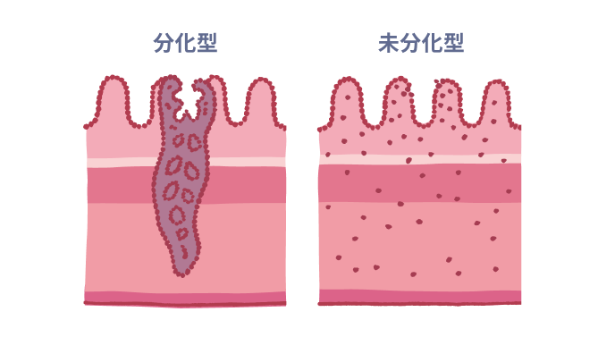 「分化型」はまとまって大きくなる一方で「未分化型」はパラパラと広がるように増殖します。一般的に「未分化型」は「分化型」よりも早く進行する傾向があるため、悪性度が高いとされています。