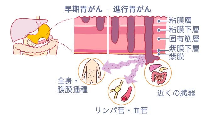 胃がんはがん細胞がどの層まで到達しているかによって「早期がん」と「進行がん」に分けられます。粘膜下層より内側にとどまっているものを「早期胃がん」、固有筋層より深くに到達しているものは「進行胃がん」に分類されます。