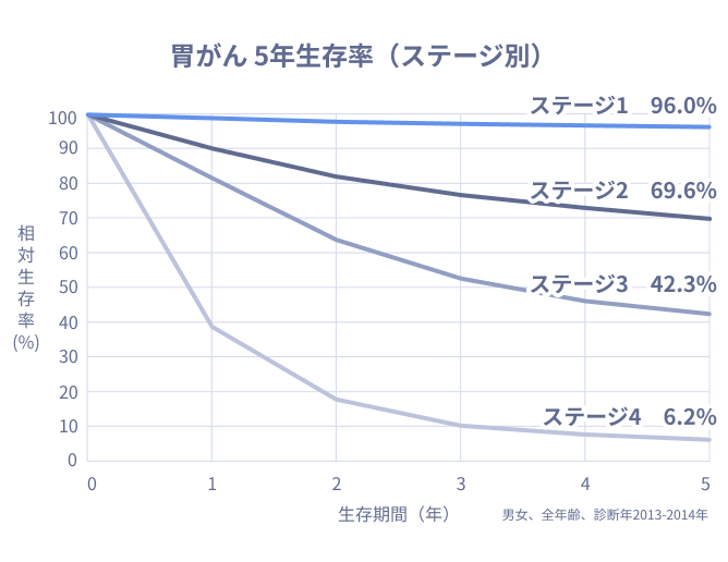 胃がんステージ1での5年生存率は96.0%に上ります。ステージが進行するにつれ生存率も低下することから、早期発見、早期治療の重要性がうかがえます。