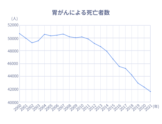 日本において胃がんで亡くなる方は毎年5万人程度でしたが、2010年代以降は大きく減少する傾向にあります。これは、検査の精度や外科・内科治療の水準が向上したためです。