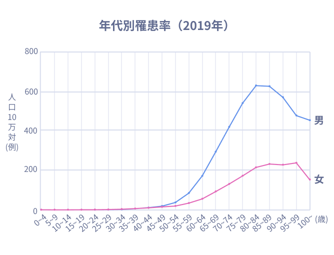 以下のグラフの通り、中高年以上に発症することが多く、特に50代以降から急増します。