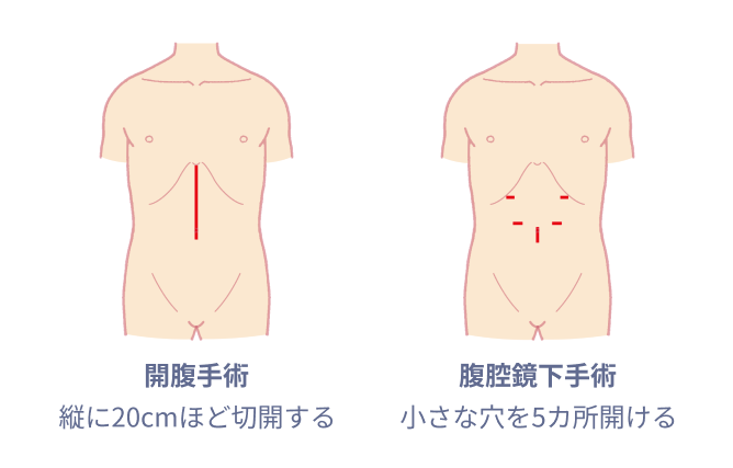手術には、「開腹手術」と「腹腔鏡下(ふくくうきょうか)手術」の大きく2つの方法があります。切除する胃の範囲や、全身麻酔をする点はどちらの方法でも同じで、どちらが推奨されるかは、がんの進行度や医療機関によって異なります。