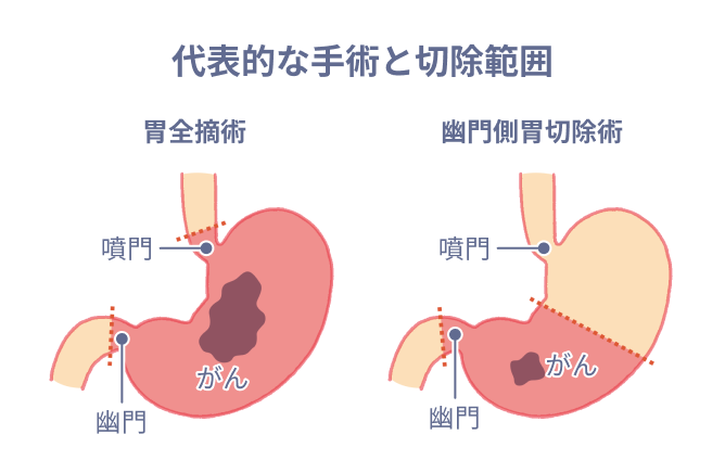 内視鏡治療によって切除しきれないがんの大きさや深さなどの場合は、手術が行われます。内視鏡治療ではがんの切除後も胃が残りますが、手術では胃(の一部もしくはすべて)を切除します。
