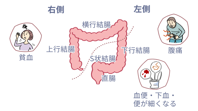 左側部分である下行結腸やS状結腸、直腸では、便が固形となり腸管の中も狭くなります。そのため、便の通りが悪くなり、痛みや嘔吐が起こりやすく、血便や便通異常なども起こります。また、腸閉塞を引き起こしやすいのも特徴です。
