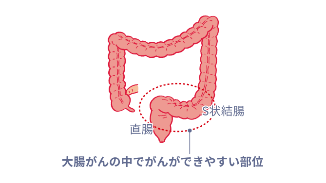 「大腸がん」とは、大腸(結腸・直腸)の表面粘膜に発生するがん*1の総称です。発生する部位により「結腸がん」と「直腸がん」に分けられます。大腸のどの部位にも発生しますが、日本人は「S状結腸」と「直腸(直腸S状部〜肛門管)」にできやすく、その両方で大腸がん全体の半数以上を占めています。