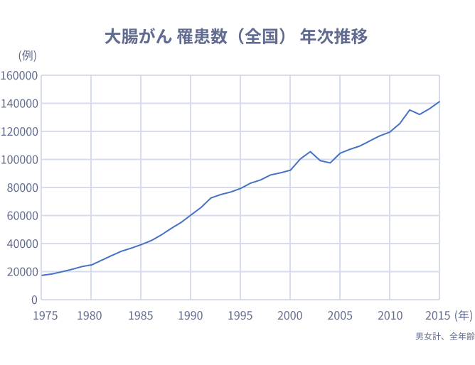 大腸がんになる人は、近年大幅に増加しています。1975年から2015年までの過去40年間を見ても、その数は7.7倍以上にも上ります。