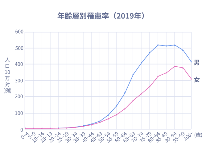1年間で大腸がんになった人を年代、性別ごとに分けて見てみると、男性が女性より多いことがわかります。また、男女ともに40歳を越えたあたりから徐々に増え始め、年齢が高くなるにつれて増加する傾向があります。
