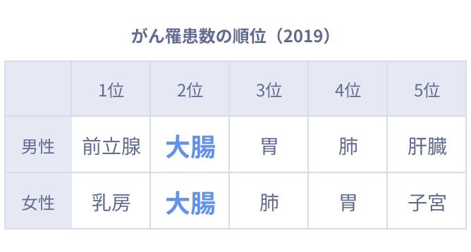 大腸がんは、日本における主要ながんとして厚生労働省の定める「5大がん*2」のひとつにも定められており、毎年定期的な「がん検診」が推奨されています。