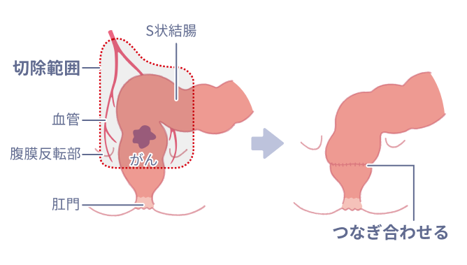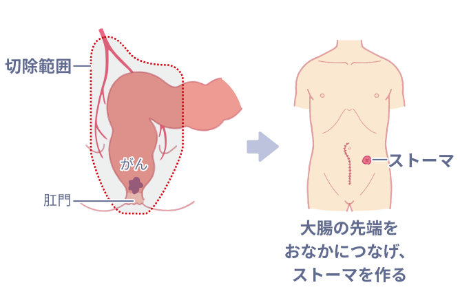 切除が終わったら、今後も食事を取れるように残った腸管同士をつなぎ合わせます。肛門の近くにがんがあるなど、そうした処置が難しい場合には、ストーマ(人工肛門)をおなかにつくる必要があります。
