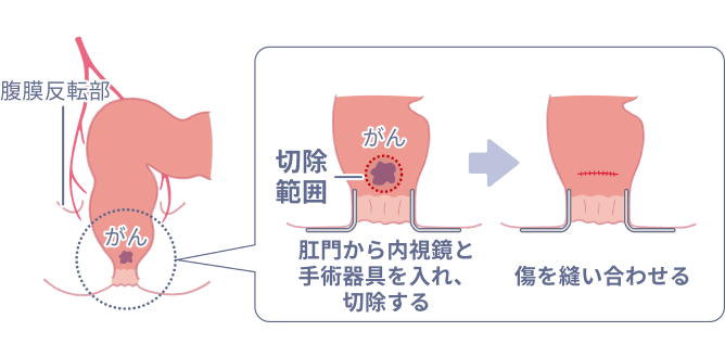肛門に近い早期がんなど、転移のリスクが低く、がんと周辺組織だけを切除すればよい場合に行われる手術です。肛門から、内視鏡と手術器具を挿入し、がんを切除、傷口を縫い合わせます(経肛門的切除)。おなかを開く必要はありません。
