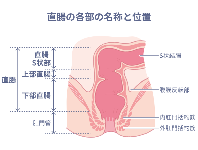 肛門から約20cmの大腸を直腸といいます。直腸は、骨盤に囲まれた深く狭い場所にあり、その周囲には前立腺や膀胱(ぼうこう)、子宮、卵巣などの臓器のほか、排尿機能や性機能を調節する自律神経も存在します。
