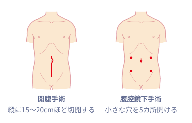 腹腔鏡下手術は、開腹手術と比べて傷が小さいため、出血や術後の痛みが少なく回復が早いというメリットがありますが、手術時間が長くなりやすい、手術が難しくなるなどの課題もあります。腹腔鏡下手術を受けるかどうかは主治医とよく相談しましょう。