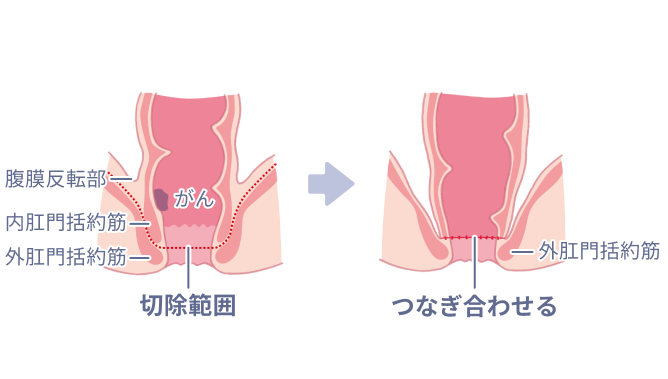 腹膜反転部より上の位置で縫い合わせる場合を高位前方切除術、(腹膜反転部より)下で縫い合わせる場合を低位前方切除術といいます。低位前方切除術では、より肛門に近い部位を切除するため、ケースによっては人工肛門(ストーマ)を作ることがあります。