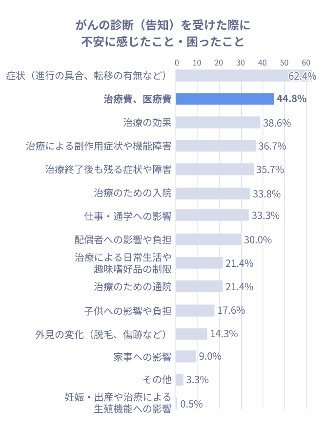 がん経験者の方(全国20~70代の男女・治療中も含む)を対象に、michitekuが実施したアンケート結果を見てみると、大腸がんと診断(告知)を受けた半数近くの方が「治療費・医療費」に不安を感じたと答えており、「症状(進行の具合、転移の有無など)」の次に気になる方が多いようです。