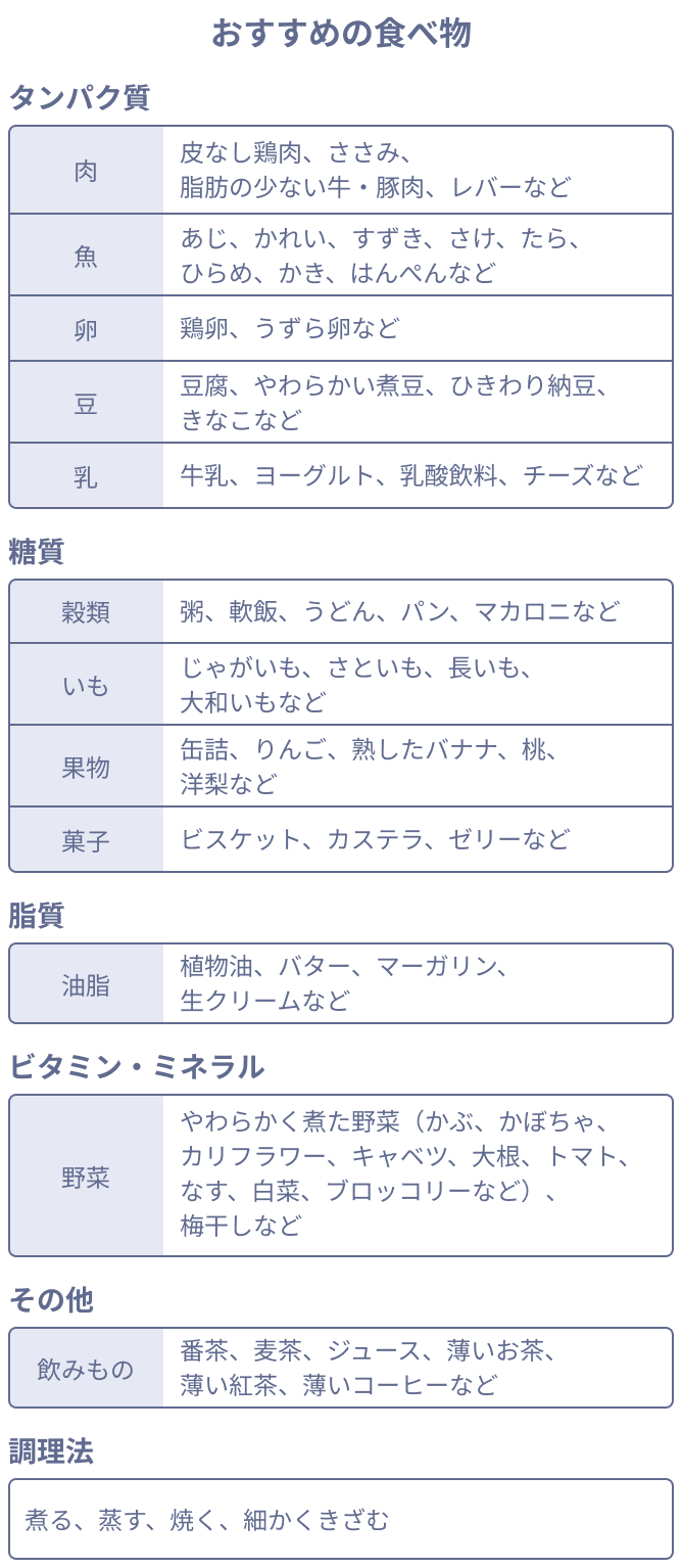 その際、弱ってしまった腸が消化不良を起こさないように、腸への負担が少ない食べ方をするようにします。消化の良い食べ物を選び、しっかりとよくかんで、ゆっくり少しずつ食べましょう。いっぺんにたくさん食べてしまうと、弱った腸に大きな負担がかかってしまうため、注意が必要です。朝・昼・晩の基本の3食は少なめに、2~3回の間食(ヨーグルトやおやつ、サンドイッチやおにぎりなどの軽食)を追加し、1日の食事を5~6回に分けて食べるとよいでしょう。