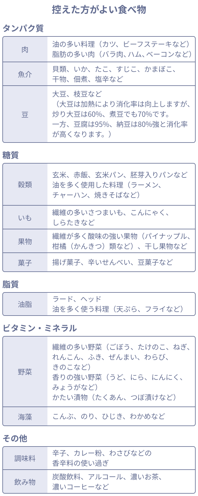 食べ物では、食物繊維の多いもの、さつま芋や豆類などのガスが発生しやすいもの、唐辛子やカフェイン・炭酸飲料などの刺激が強いものは、控えめにするなどがあります。