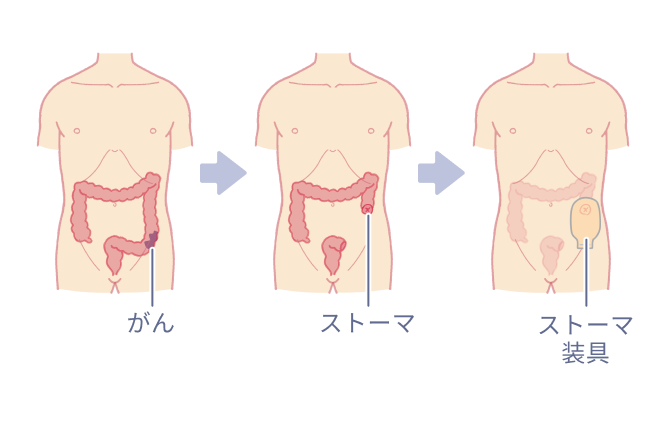 大腸がんの手術で、肛門や肛門に近い部位の切除が必要な場合は、手術の際にストーマをつくります。ストーマとは、切除して残った側の腸管の端をおへその横あたりから外に出して固定し、新しい排せつ口(肛門)とするものです。ストーマをつくることを「ストーマの造設」といい、造設に伴って、従来の肛門(お尻の穴)は閉じられます。