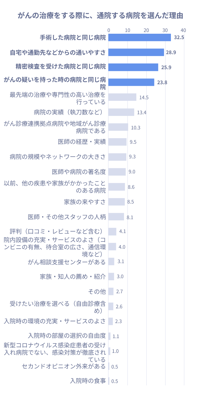 通院する病院を選ぶ理由としては「手術した病院と同じ病院(32.5%)」が最も多く、次いで「自宅や勤務先などからの通いやすさ(28.9%)」が多い結果となりました。その他には、「精密検査を受けた病院と同じ病院(25.9%)」「がんの疑いを持った時の病院と同じ病院(23.8%)」という回答も比較的多く挙げられています。