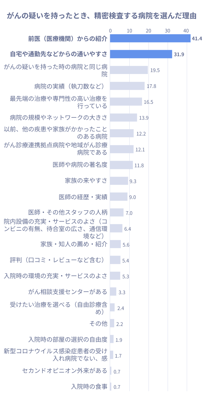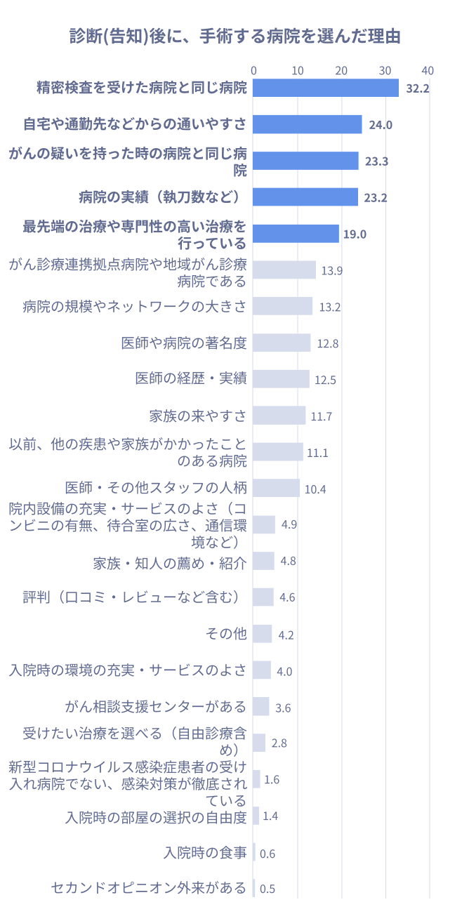 この設問では「精密検査を受けた病院と同じ病院(32.2%)」を選んでいる方が最も多く、その次に「自宅や勤務先などからの通いやすさ(24.0%)」「がんの疑いを持った時の病院と同じ病院(23.3%)」「病院の実績(執刀数など)(23.2%)」がほぼ同列という結果となっています。