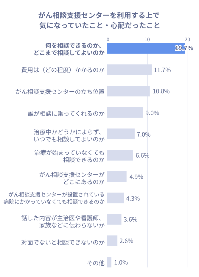 1番多かった回答は「何を相談できるのか、どこまで相談してよいのか(19.7%)」ですが、それ以外にも相談にかかる費用や相談相手のこと、相談するタイミングや設置場所といった、がん相談支援センターにおける具体的な機能や体制についての項目が並びました。