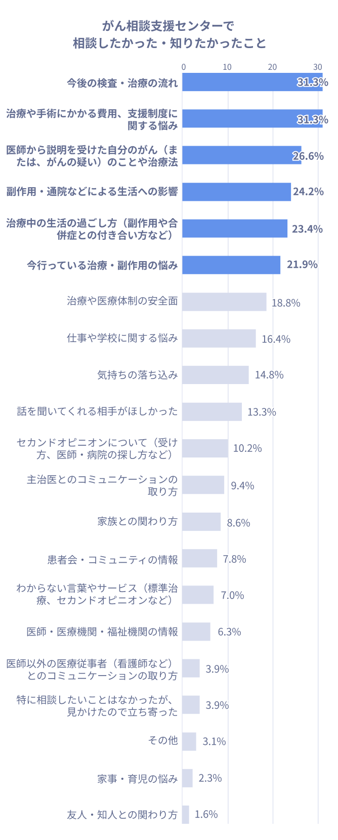上位には「今後の検査・治療の流れ(31.3%)」「医師から説明を受けた自分のがん(または、がんの疑い)のことや治療法(26.6%)」といった、治療に直接関係するものが多く挙がっています。