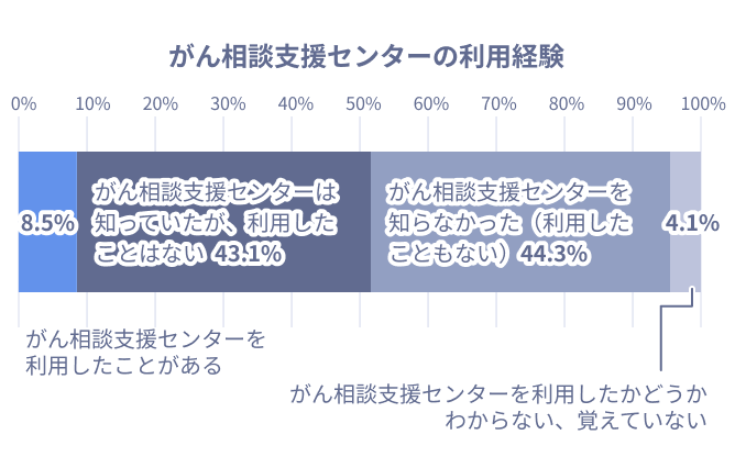 さまざまなことを相談できるがん相談支援センターですが、今回のアンケートの結果では、がん経験者の中でも利用率は高いとは言えない状況にあります。