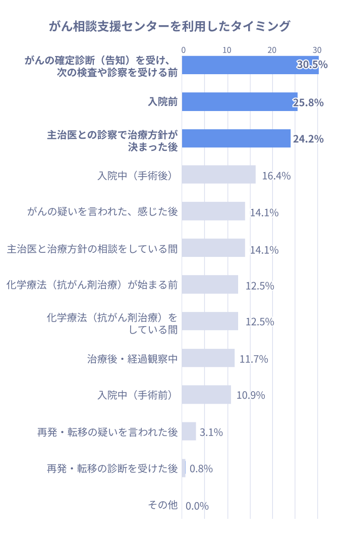 アンケートの結果では、「がんの確定診断(告知)を受け、次の検査や診察を受ける前(30.5%)」に利用した方が最も多く、次いで「入院前(25.8%)」「主治医との診察で治療方針が決まった後(約24.2%)」が並びました。このことから、入院や治療が始まる前に利用する方が多いことが伺えます。