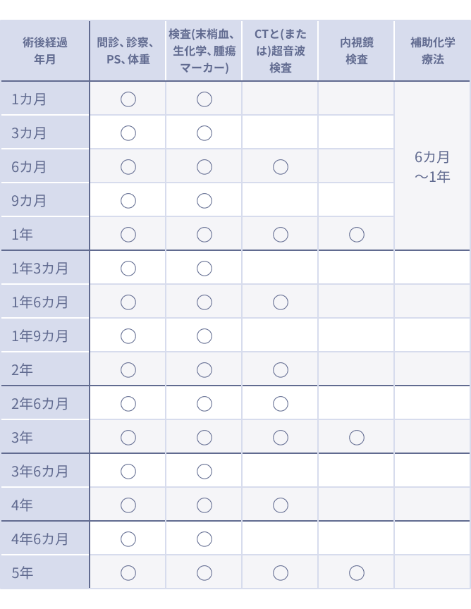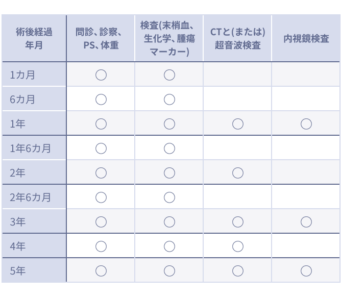 胃がんの再発は、治療後3~5年以内にみられることが多いとされています。そのため、頻度は状況により異なりますが、少なくとも手術後5年間は通院する必要があります。通院時には、遠隔転移*2や局所再発*3、胃がんとは別にできるがん*4を早期に発見するために、腫瘍マーカー、CT検査、内視鏡検査などが行われます。