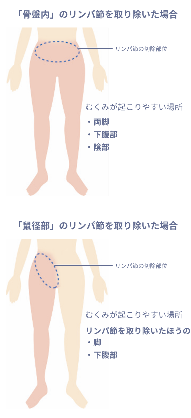 たとえば、骨盤内のリンパ節を切除した場合には、両脚や下腹部、陰部にむくみが出やすくなります。一方、鼠径部(脚のつけ根)のリンパ節を取り除いた場合は、手術を行った側の脚や下腹部にむくみが現れやすい傾向があります。